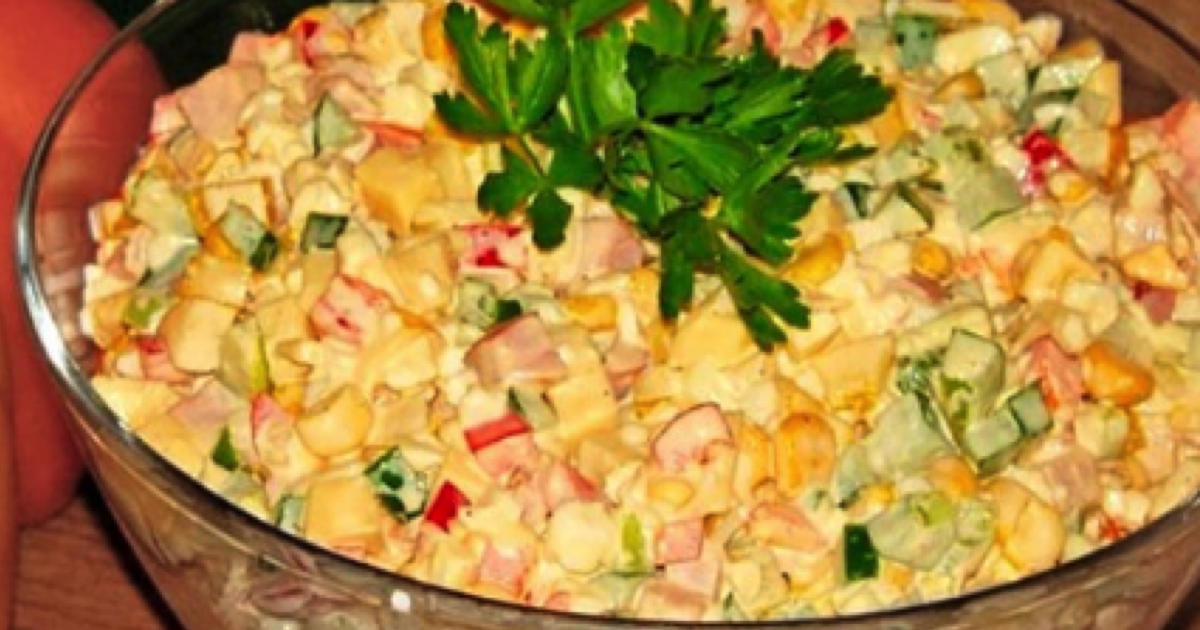 Wszystkie składniki wymieszaj w głębokiej misce. Kukurydzę odsącz i dodaj do całego dania. Całość zapraw majonezem (około 4 łyżki) lub opcjonalnie jogurtem naturalnym – wtedy sałatka będzie lżejsza. Dodaj sól i pieprz.