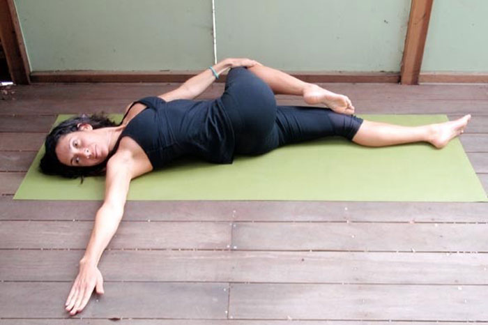 Połóż się na podłodze i lewą rękę trzymaj rozciągniętą na bok. Ugnij swoją lewą nogę w kolanie i skręć w prawo. Prawą ręką przytrzymaj zgiętą nogę, a głową skręć w lewo. Wytrzymaj tak przez chwilę i zmień stronę.