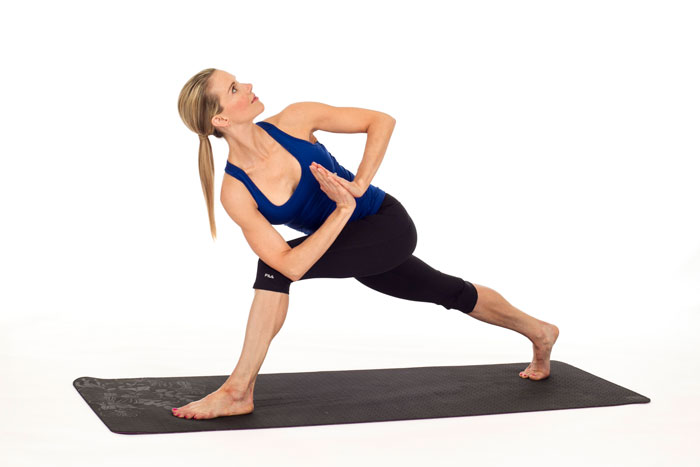 Łokieć przytrzymaj na zewnętrznej stronie kolana i przyciśnij swoje dłonie. Wytrzymaj 30 sekund i zmień stronę.