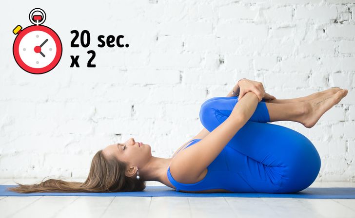 W takiej pozycji, z kolanami blisko klatki piersiowej wytrzymaj około dwudziestu sekund. Po każdorazowym rozluźnieniu ciała powtórz ćwiczenie jeszcze dwa razy. To ćwiczenie prócz ulgi w bólu, wzmocnienia mięśni, poprawia też ruchliwość mięśni tej części pleców.