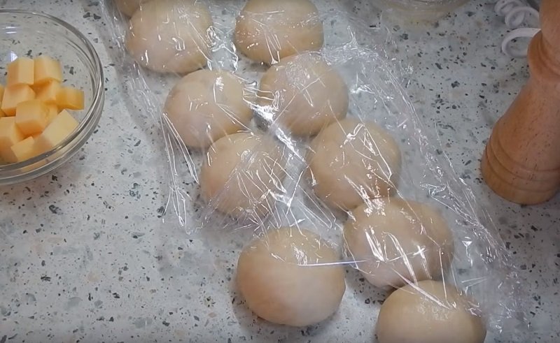 Po upływie 30 minut ciasto podziel na ok. 20 kawałków (lub według własnego uznania) i uformuj z nich bułeczki. Ser pokrój w kostkę o bokach mniej więcej 2-3 cm i delikatnie umieść kostki w środku bułeczek. Po włożeniu sera ciasto uformuj tak, aby zakrywało ono cały ser.