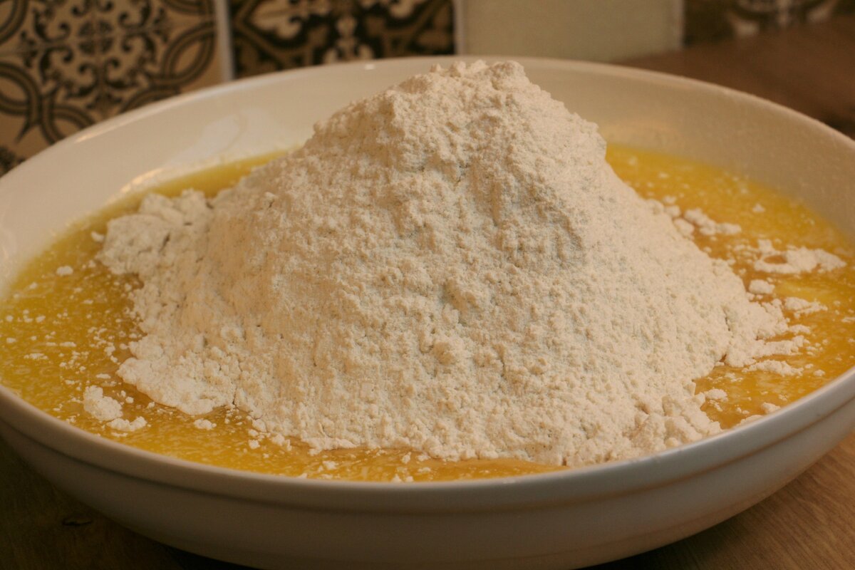 Połącz wszystkie składniki, aż się dobrze połączą. W osobnej misce wymieszaj mąkę i drożdże.
