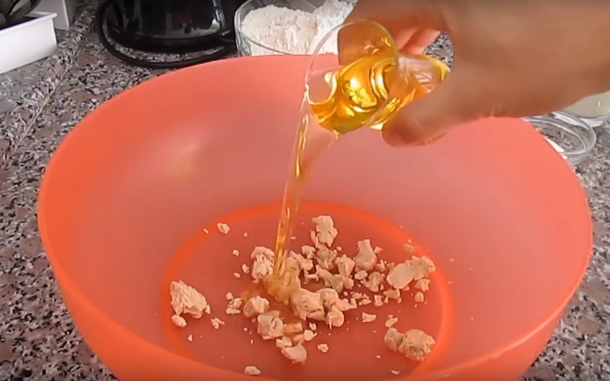 Delikatnie rozkrusz w misce droższe i dolej do nich 150 ml oleju roślinnego. Następnie dodaj kolejne składniki – mleko i sól. Dokładnie wymieszaj wszystkie produkty, które znajdują się w naczyniu.
