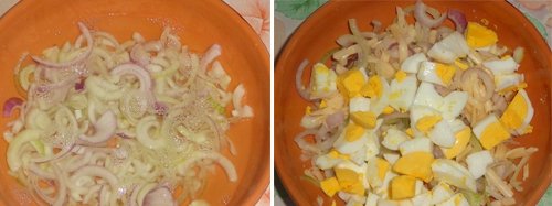 Do miski włóż pokrojone jajka, marynowaną cebulę i majonez lub śmietanę. Przypraw do smaku swoimi ulubionymi przyprawami i połącz dokładnie.