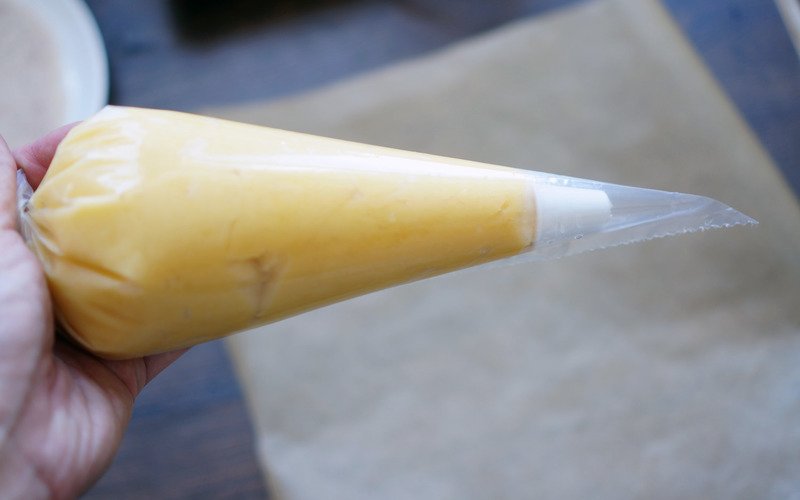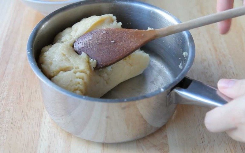 Weź rondel, dodaj do niego wodę. Następnie dodaj masło. Doprowadź do wrzenia. Następnie dodaj mąkę. Najpierw jednak przesiej mieszankę przez sito. Ciągle mieszaj, aby ciasto nie stało się grudkowate. Następnie zdejmij mieszankę z ognia i dodaj jajka. Upewnij się, że jajka są całkowicie rozpuszczone w cieście.