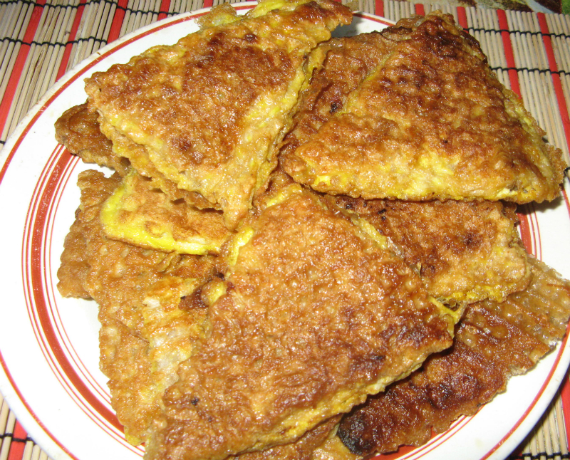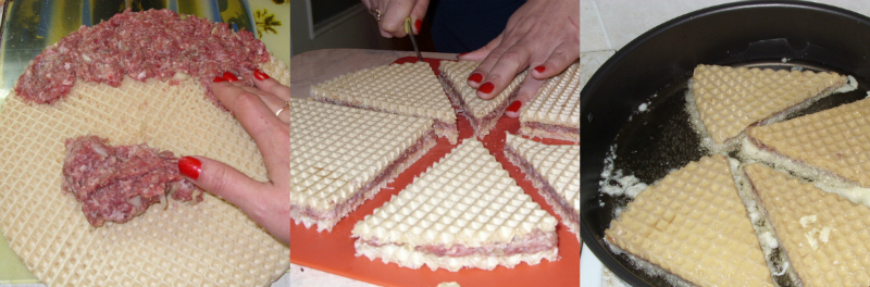 Do miski wlej mleko, dodaj dwa jajka i wymieszaj. Pokrojone wafle z mięsem zanurzaj w powstałej masie i smaż na rozgrzanej patelni po obu stronach. Długość smażenia zależy od grubości wafli.