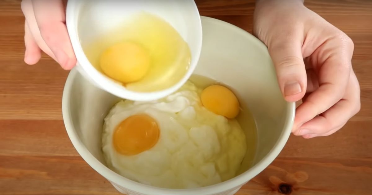 Wlej słodki jogurt do głębokiej miski. Dodaj do tego jajka. Wymieszaj składniki trzepaczką, aż będą gładkie. Przesiej nad nimi skrobię kukurydzianą.