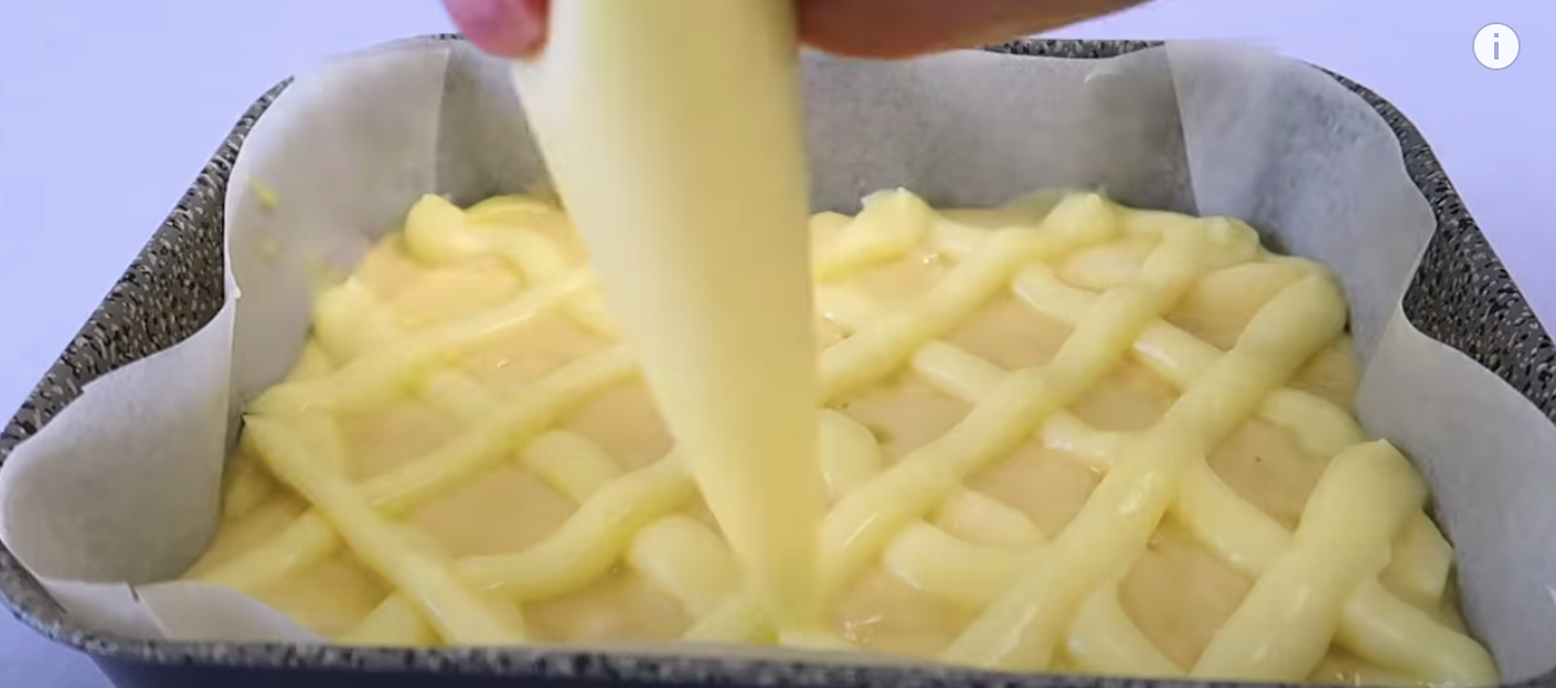 Ciasto wymieszać również z pokrojonymi w plasterki jabłkami. Przelać na formę do pieczenia wyłożoną pergaminem. Na wierzchu z kremu utworzyć kratkę ze szprycy cukierniczej.