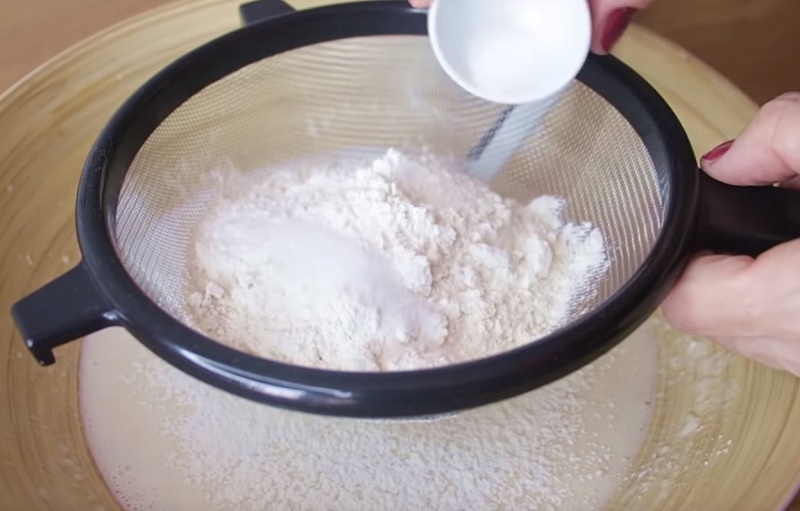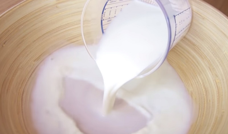 Wlej ciepłe mleko do miski, dodaj drożdże i cukier, wymieszaj, przykryj folią spożywczą i odstaw na 10 minut.