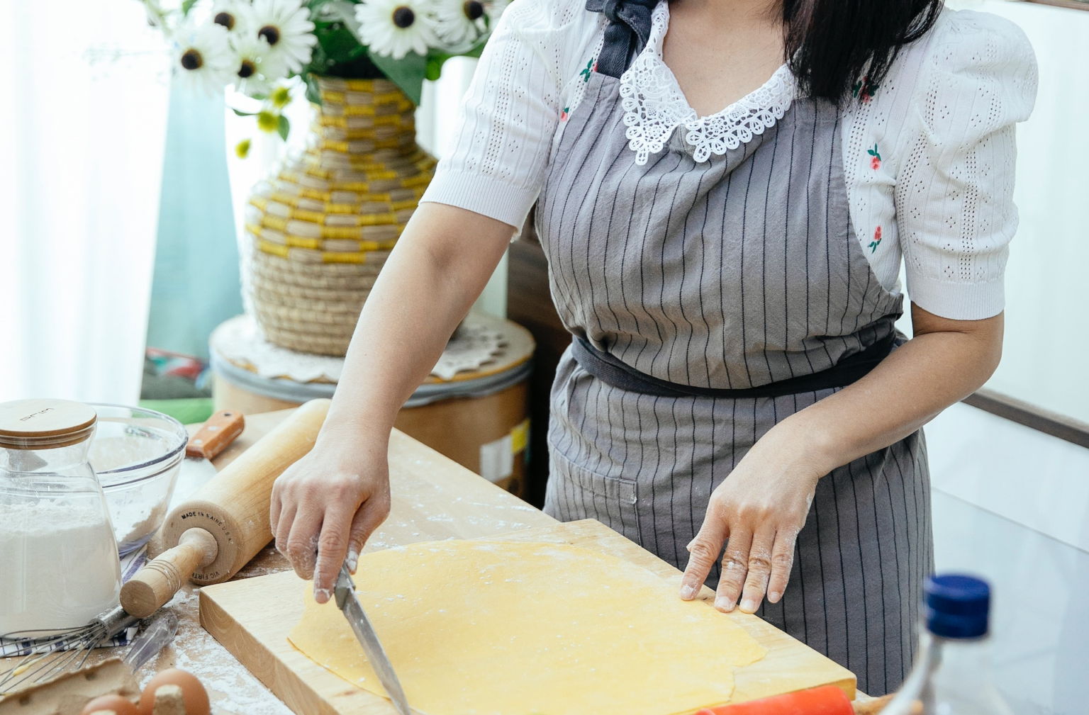 Dodać sok z cytryny wraz ze skórką otartą z cytryny. Ciasto podzielić na trzy równe części. Pierwszą blachę ułożyć na blaszce wyłożonej papierem do pieczenia. Nakłuwamy widelcem, nakładamy jabłkowy nadzienie.