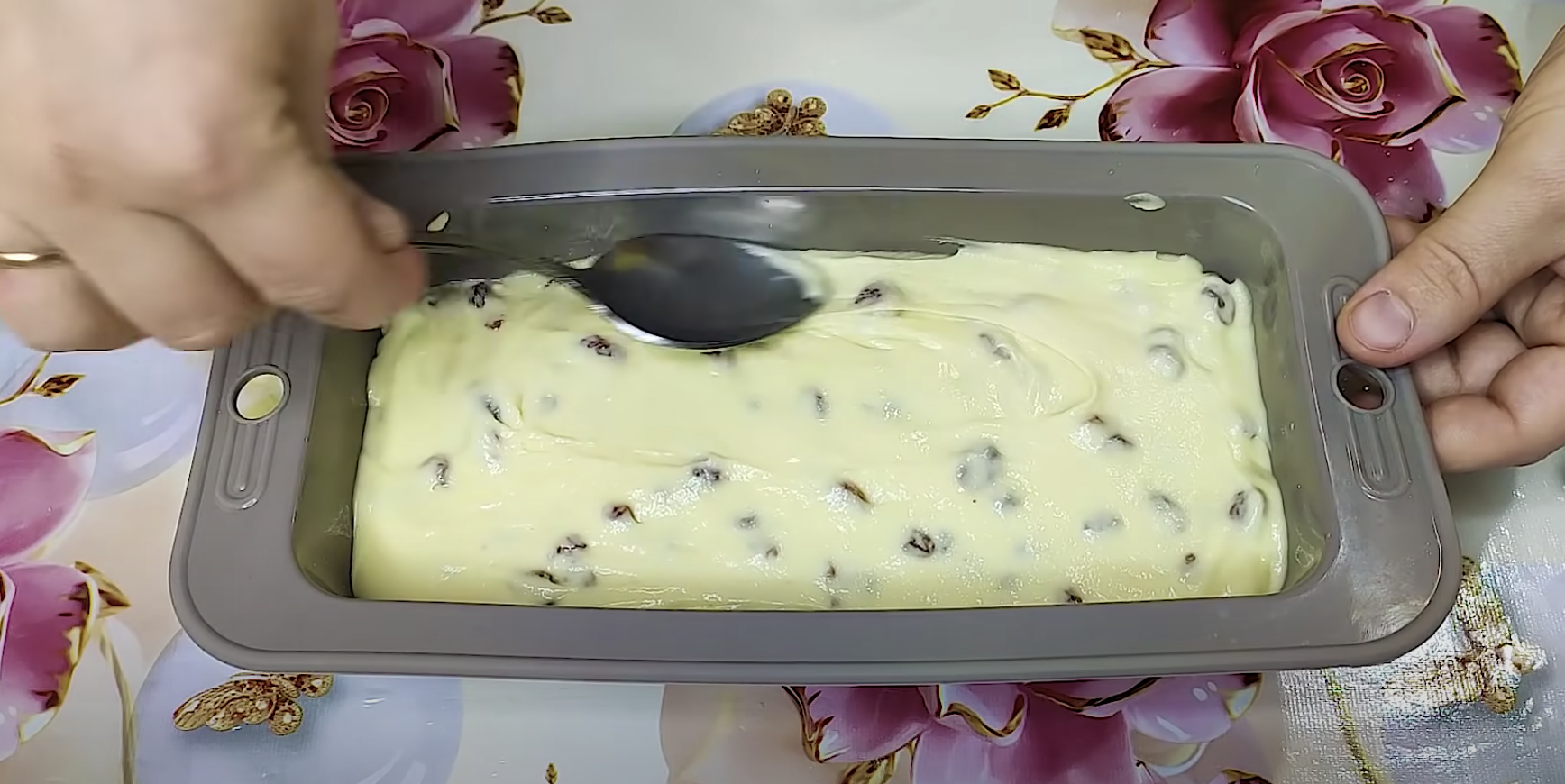 Stopniowo dodaj mąkę i proszek do pieczenia, wymieszaj do uzyskania gęstego i jednorodnego ciasta. Dodaj rodzynki (lub inne dodatki) i ponownie wymieszaj. Wlej ciasto do formy (10 * 22 cm) i włóż do piekarnika nagrzanego do 170 ° C na 30-35 minut.