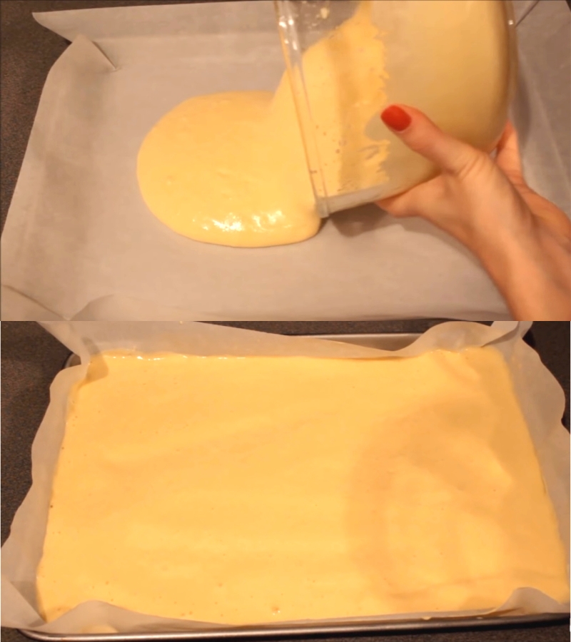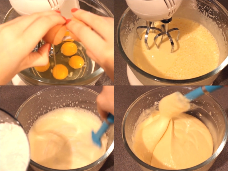 Do dużej miski wsyp mąkę, skrobię i proszek do pieczenia, a następnie wszystko wymieszaj. Do osobnej miski wbij 4 jaja, dodaj do nich bardzo gorącej wody, a potem ubij za pomocą miksera.