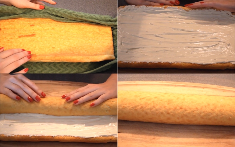 Gdy ciasto skończy się piec, wyjmij je z blachy i połóż na ręczniku i zwiń w luźny rulon. Ostygnięte ciasto odwiń, posmaruj przygotowanym nadzieniem i ponownie zwiń. Następnie owiń je folią spożywczą i wstaw do lodówki.