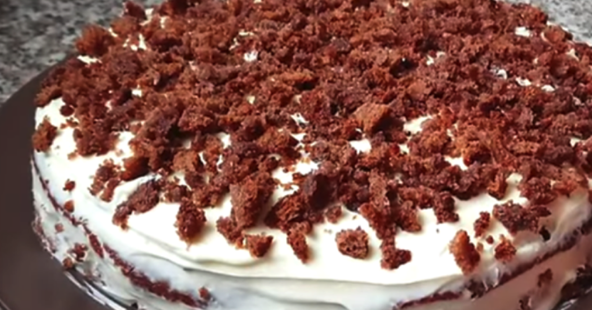 Jedną cześć posmaruj przygotowanym kremem i połóż drugą warstwę ciasta. Wierzch posmaruj masą i obsyp pokruszonymi odciętymi bokami ciasta. Tak przyrządzony deser jest już gotowy do jedzenia. Wyśmienicie smakuje w towarzystwie kawy.