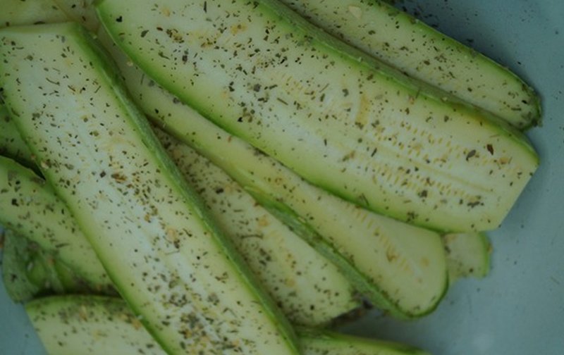 Na początku należy dokładnie umyć cukinię, a następnie pokroić ją w plastry o grubości około centymetra. Potem wkłada się je do miski, przyprawia i odstawia na 10 minut.