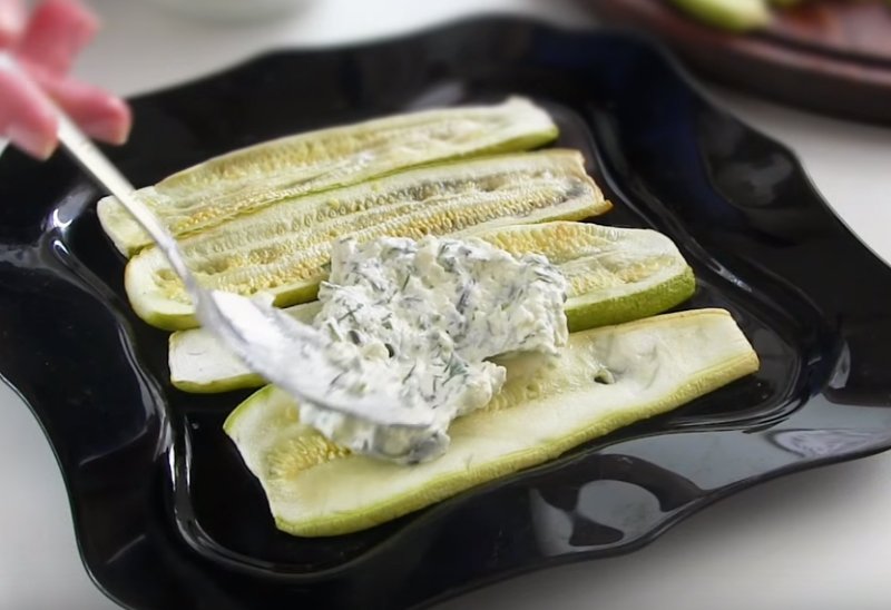 Kiedy cukinia nareszcie jest gotowa, można kontynuować tworzenie wypieku. Plastry należy umieścić na sporym talerzu, po czym posmarować je sosem i posypać startym serem.