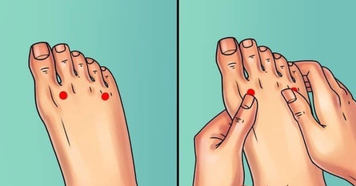 Znajdź punkty akupresury pokazane na rysunku, jeśli po długim dniu czujesz, że Twoje stopy są zmęczone lub obolałe. Znajdują się one między dwoma ostatnimi i pierwszym palcem stopy. Przez 10-15 minut kładź kciuki na stopach i delikatnie je masuj. Masaż ten pomoże rozluźnić napięty kark.