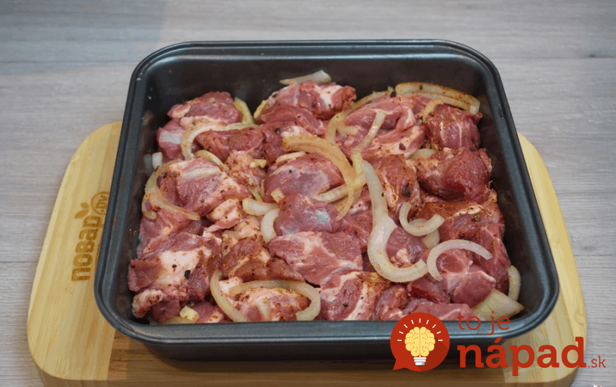 Połóż plastry mięsa na cebuli. Solimy je. Wszystkie plastry natrzeć rozgniecionym czosnkiem.