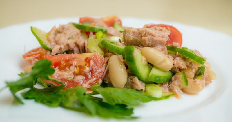 Tuńczyka rozgnieć przy pomocy widelca i dodaj do pozostałych składników. Całość udekoruj cebulowymi krążkami. Następnie dopraw do smaku solą, pieprzem i włoskimi ziołami. Możesz się zajadać!