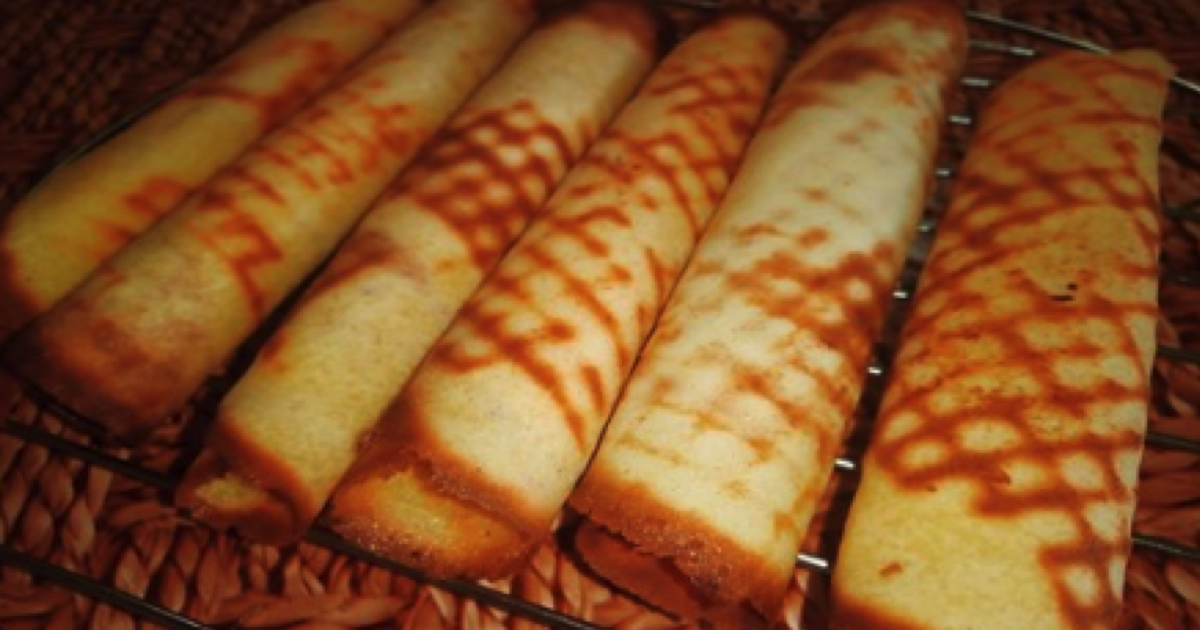 Smaż gofry na suchej, lekko ciepłej patelni. Rozłóż 1 łyżkę ciasta, delikatnie rozmazując je na całej powierzchni. Każdy gofr musi być smażony przez kilka minut z każdej strony. Od razu po ściągnięciu z patelni zawijaj gofry w rulon.
