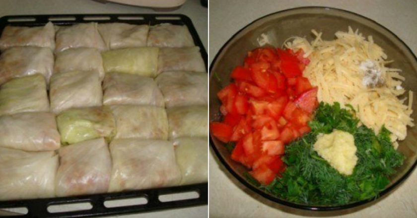Farsz razem z mielonym mięsem zawijamy w liście kapusty tak,, jak w przypadku tradycyjnych gołąbków. Tak uformowane gołąbki kładziemy w formie do pieczenia, którą wcześniej smarujemy masłem.