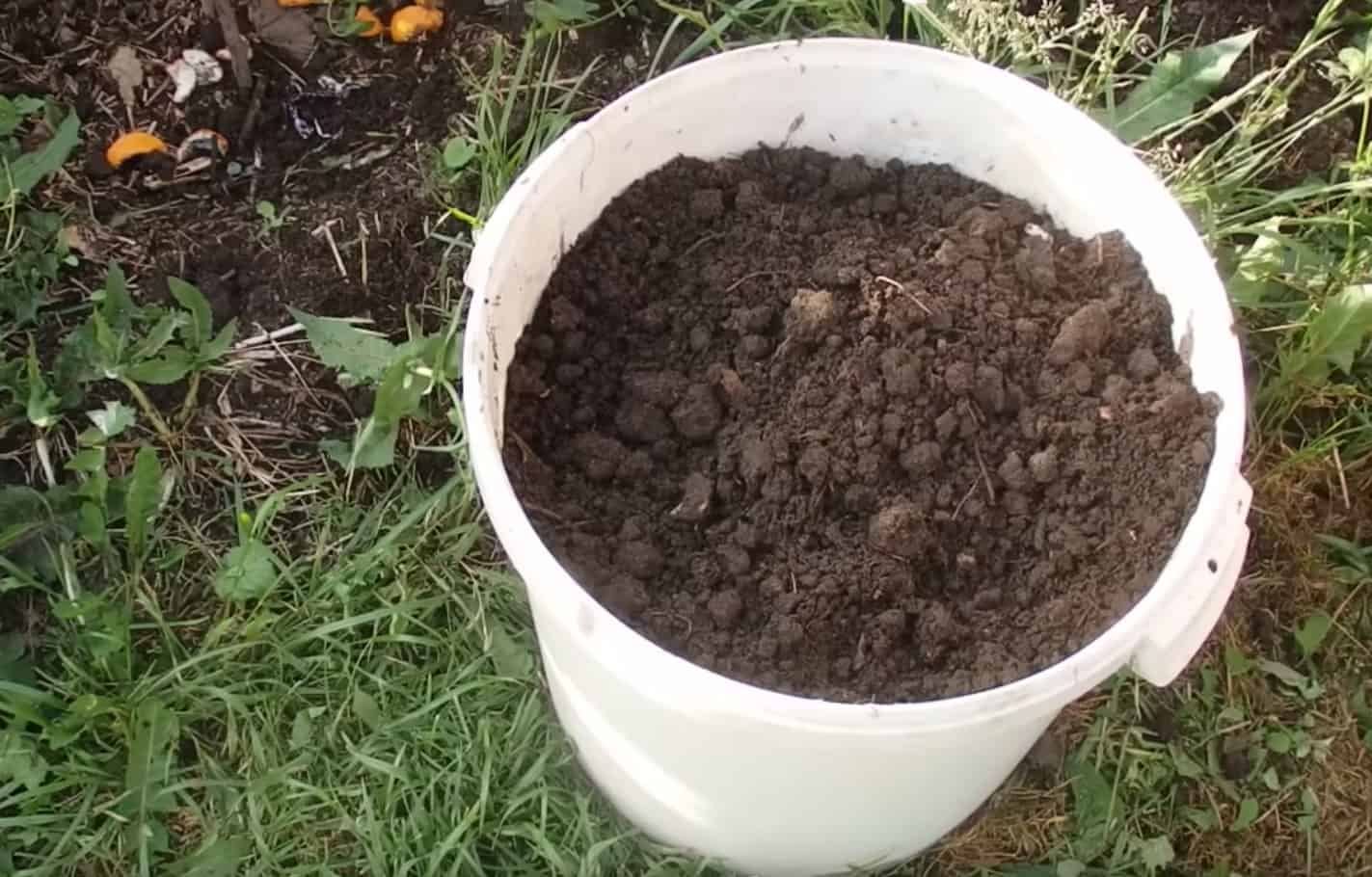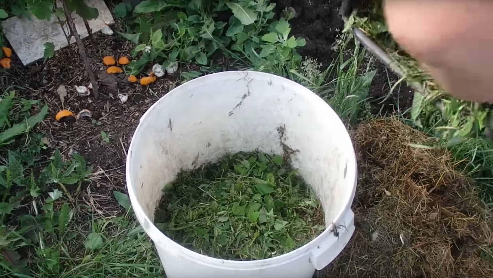 Ogórki potrzebują ciepłego miejsca, więc weź plastikowe wiadro i ułóż w nim skoszoną trawę do około 3/4 wysokości wiadra.