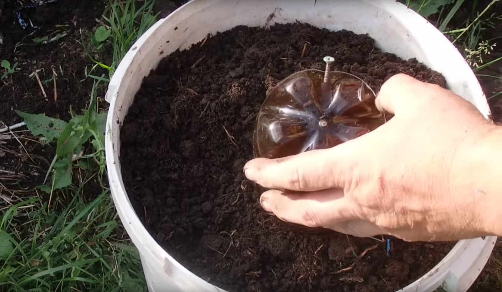 Butelkę napełnij wodą, włóż ją szyjką (czyli do góry dnem) w ziemię i przykręć jedną śrubę do dna butelki.