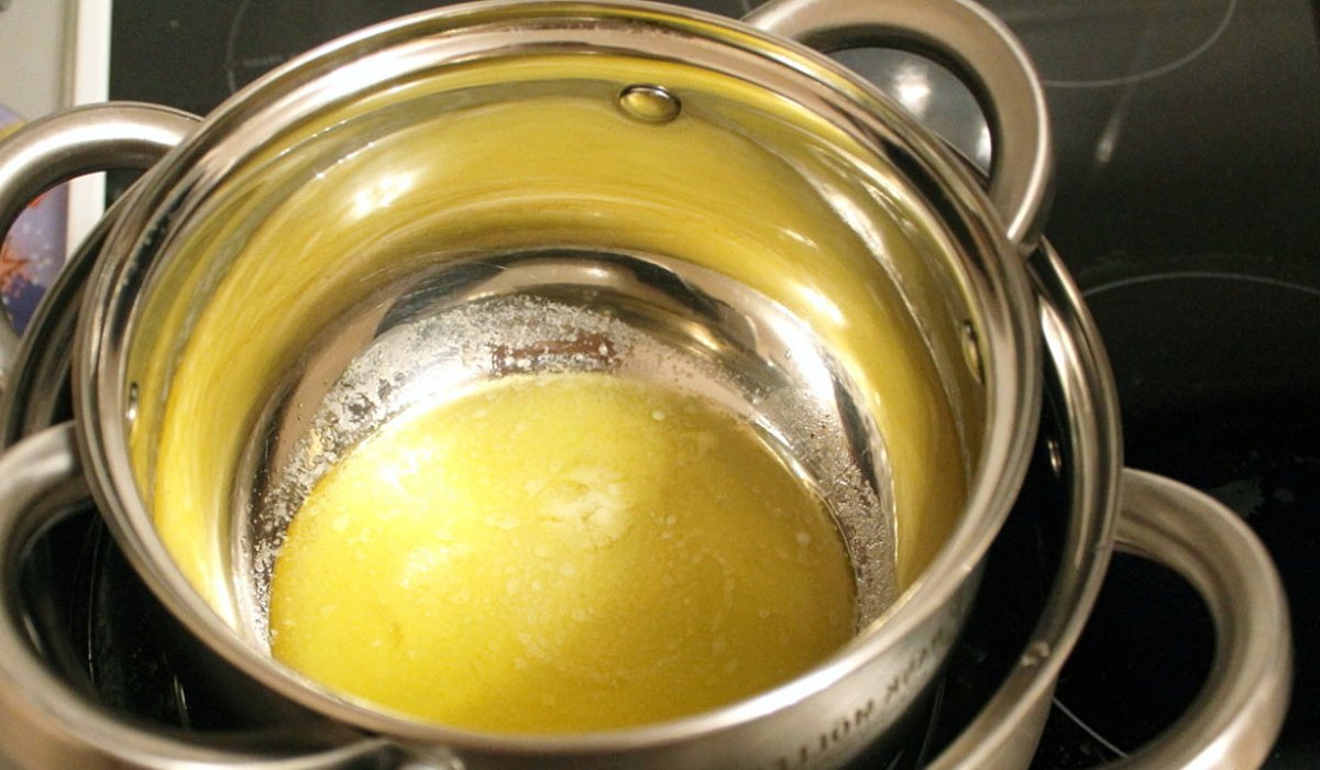 Masło umieścić w rondelku nad płomieniem. Najlepiej użyć rondelka nad ogniem. Dodajemy miód, mieszamy do uzyskania gładkiej masy.