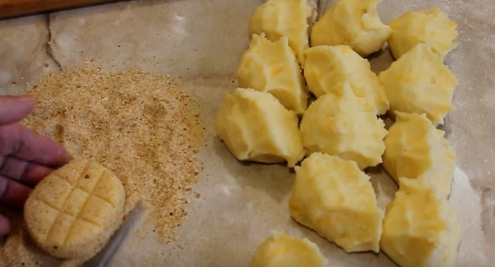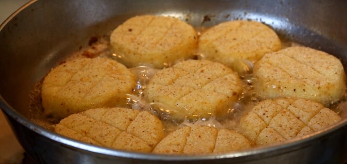 Tak przygotowane można delikatnie ponacinać, by uzyskać efekt kratownicy. Smażyć na rozgrzanym oleju z dodatkiem masła, aż do uzyskania złocistego koloru.