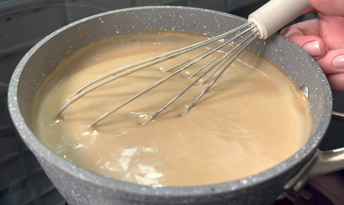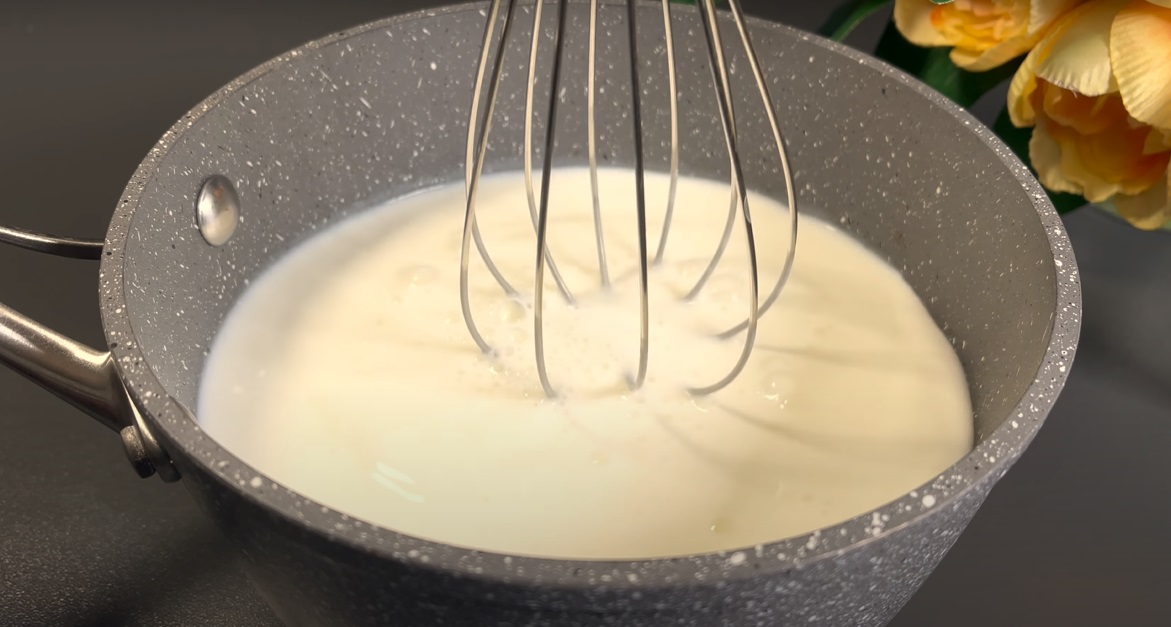 Następnie rozpuść skrobię kukurydzianą w 50 ml zimnej wody i dodaj do mleka, intensywnie mieszając. Gotuj, aż masa zgęstnieje, stale mieszając.