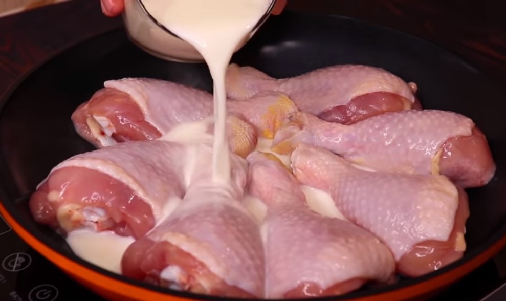 Dobrze umyj udka z kurczaka i osusz je ręcznikami papierowymi. Weźmy głębszy garnek, włóż do niego mięso. Zalej je mlekiem i wodąDopraw solą i pieprzem.