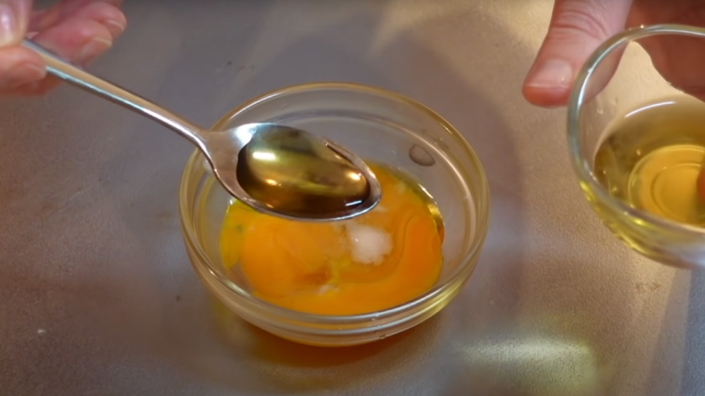 W misce wymieszać ze sobą żółtko, olej kokosowy i oliwę. Wywar z rumianku należy dodać na końcu.