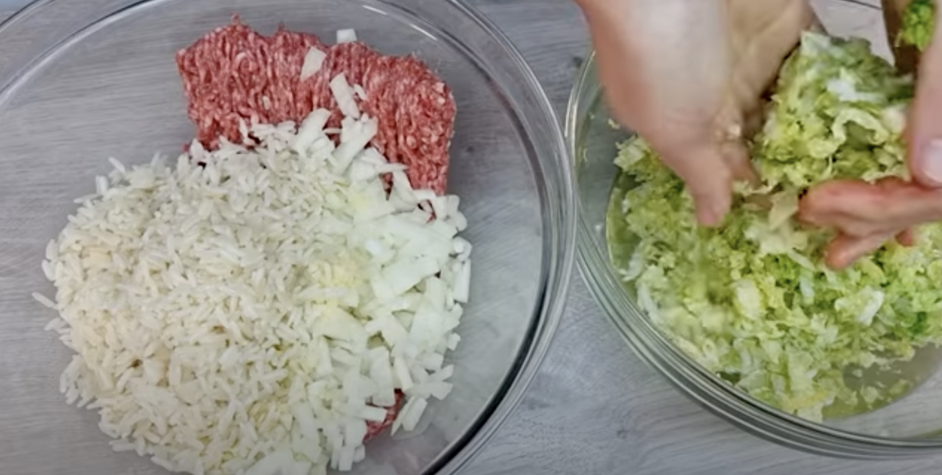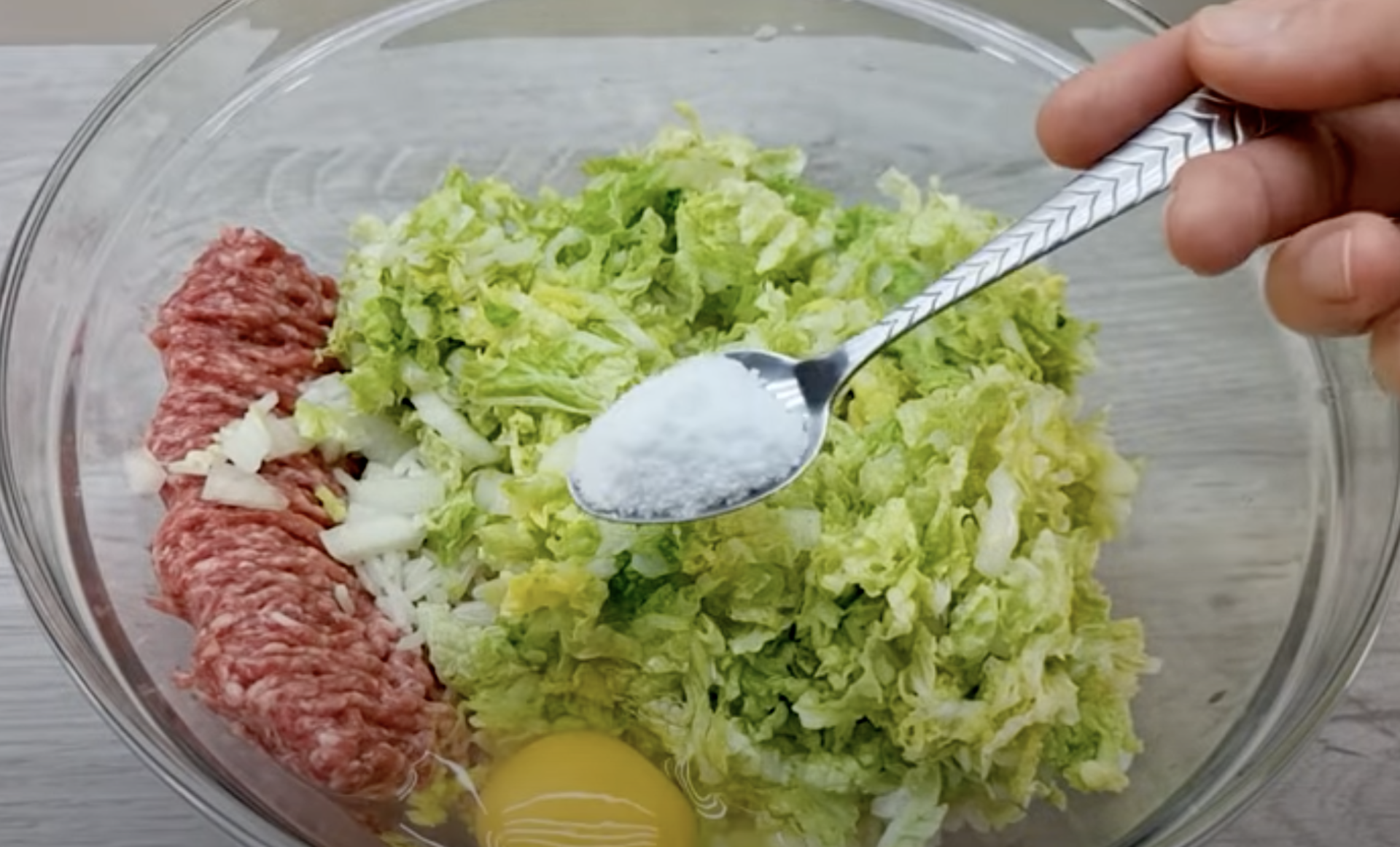 Dodaj posiekane mięso do kapusty.