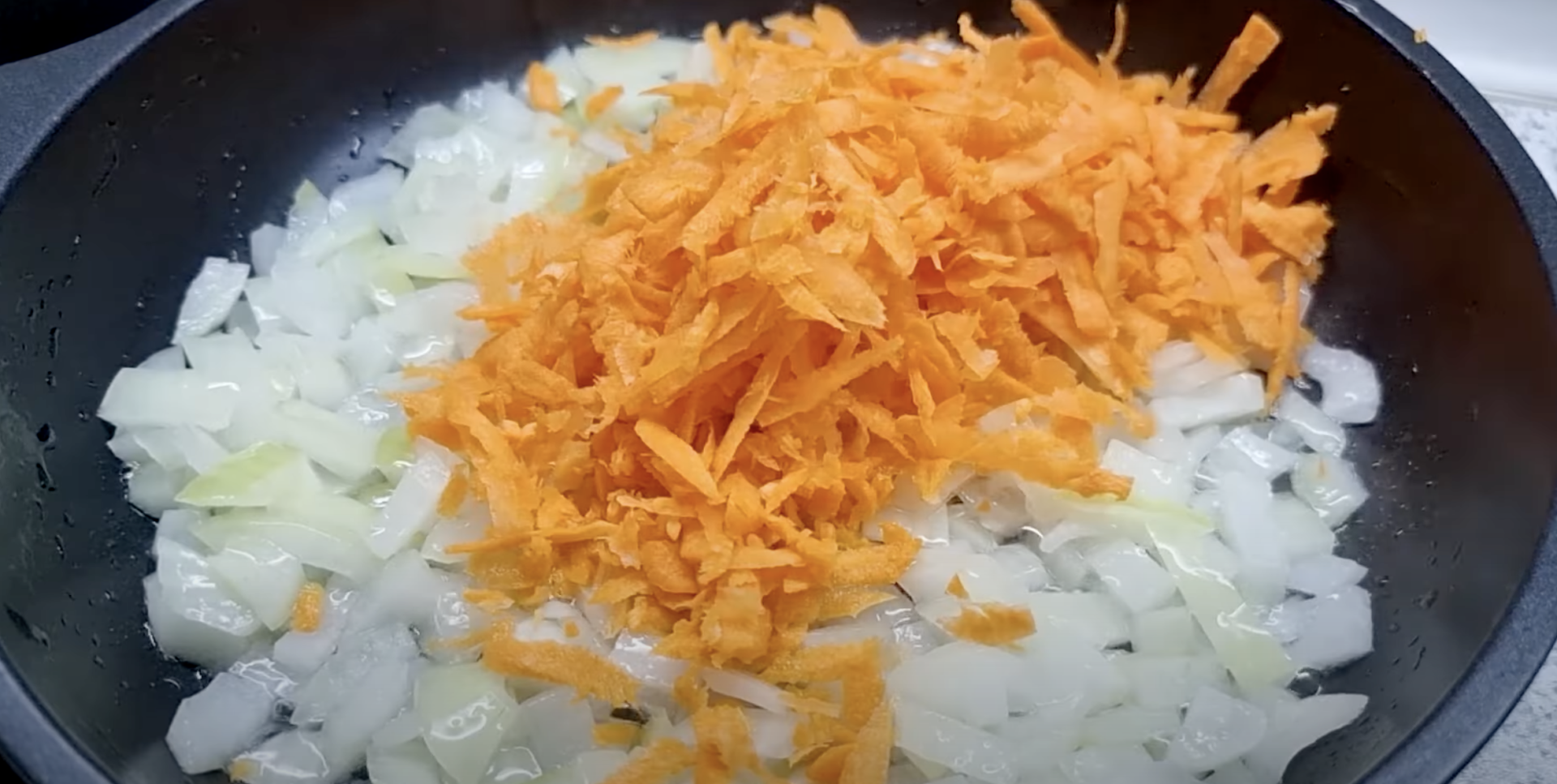 Posiekaj cebulę i zetrzyj marchewki na tarce. Na dużej patelni rozgrzej olej i podsmażaj cebulę przez około 1-2 minuty.