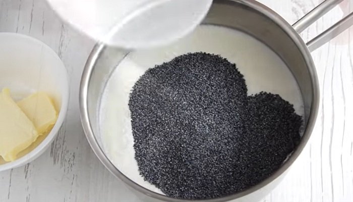 Do rondelka wlej zimne mleko, dodaj mak, cukier oraz masło. Wymieszaj wszystko trzepaczką i postaw na kuchence na średnim ogniu. Doprowadź masę do września cały czas mieszając.