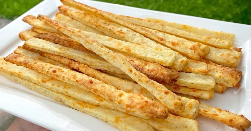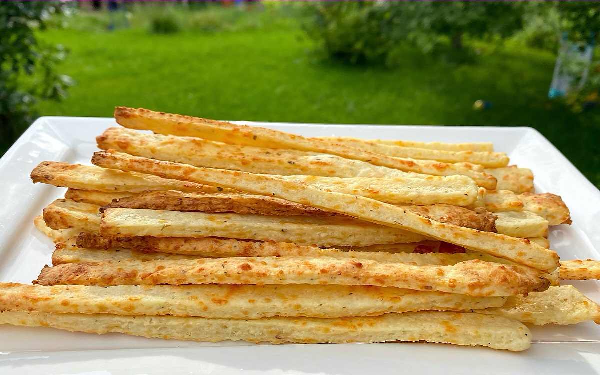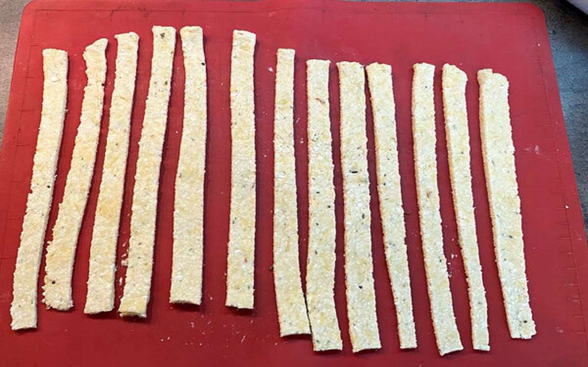 Schłodzone ciasto rozwałkować, a następnie pokroić w paski. Pieczemy w piekarniku nagrzanym do 200°C przez około 25 minut.