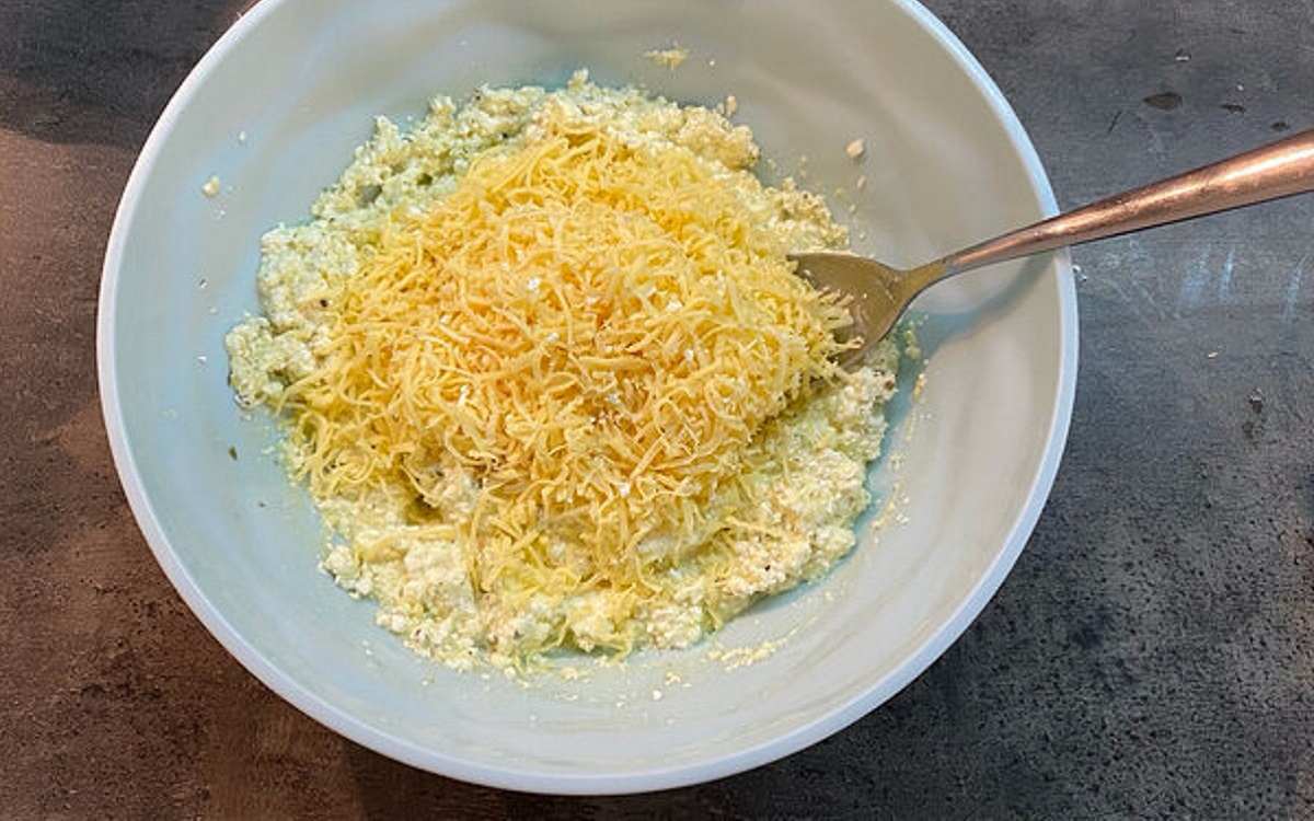 Ser zetrzyj na drobnej tarce i dodaj do masy twarogowej.