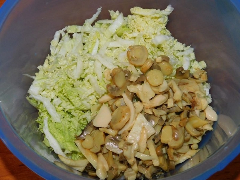 Mięso z kurczaka natrzyj przyprawami i upiecz do miękkości w piekarniku uprzednio nagrzanym do temperatury 180 °C. Pokrój je na większe kawałki. Grzyby obierz i posiekaj na plasterki. Usmaż je na oliwie z oliwek aż zbrązowieją. Poszatkuj kapustę, a pomidorki przekrój na połówki