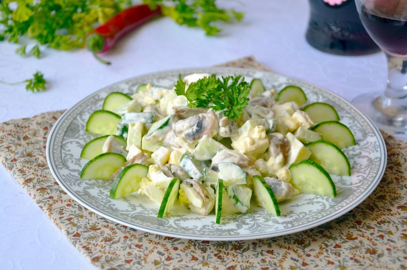 Ugotuj jajka na twardo, obierz je i posiekaj na większe kawałki. Obierz, pokrój pieczarki na ćwiartki i usmaż je na maśle. Ogórki obierz i pokrój na duże kawałki. Wszystkie przygotowane składniki wymieszaj, dodaj majonez lub jogurt i dodaj przyprawy.