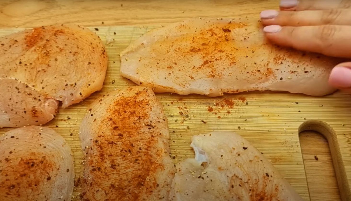 Piersi można pokroić na małe kawałki. Następnie rozbić je tłuczkiem. Przyprawić mięso przygotowanymi przyprawami, upewniając się, że są one równomiernie rozprowadzone po obu stronach.