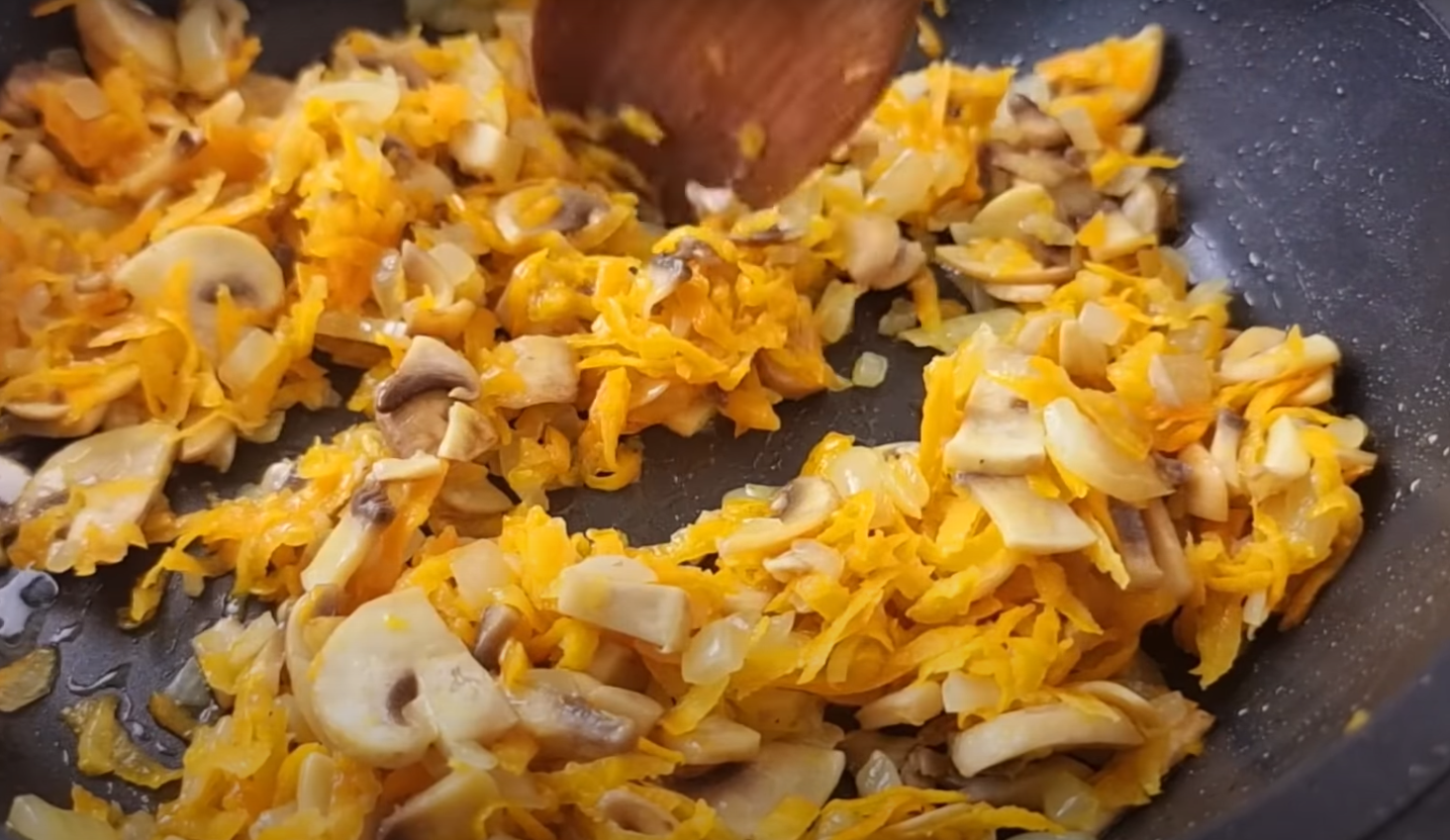 Pokrój cebulę na małe kawałki. Marchew obrać i zetrzeć na tarce. Grzyby przed pokrojeniem na małe kawałki należy dokładnie umyć. Na dużej patelni rozgrzać olej i dodać cebulę. Smażyć cebulę, aż stanie się złotobrązowa. Następnie dodać startą marchewkę i pokrojone w plasterki grzyby. Dusić na wolnym ogniu jeszcze przez kilka minut.