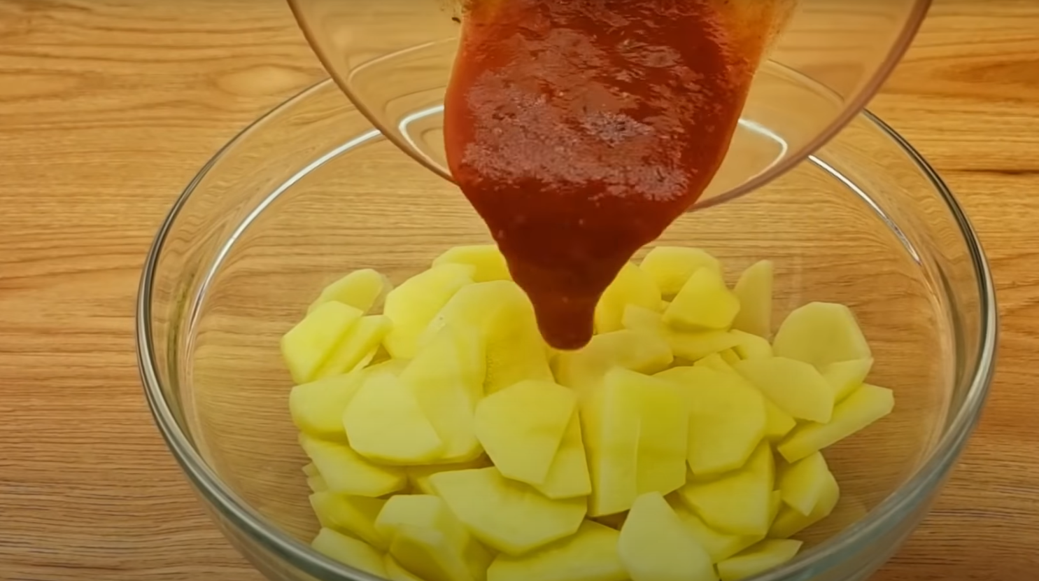 Obierz ziemniaki i pokrój je na małe kawałki. W misce wymieszaj koncentrat, rozgnieciony czosnek, wodę i sól. Połączyć.
