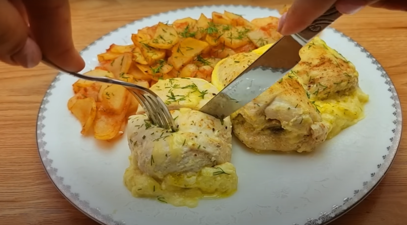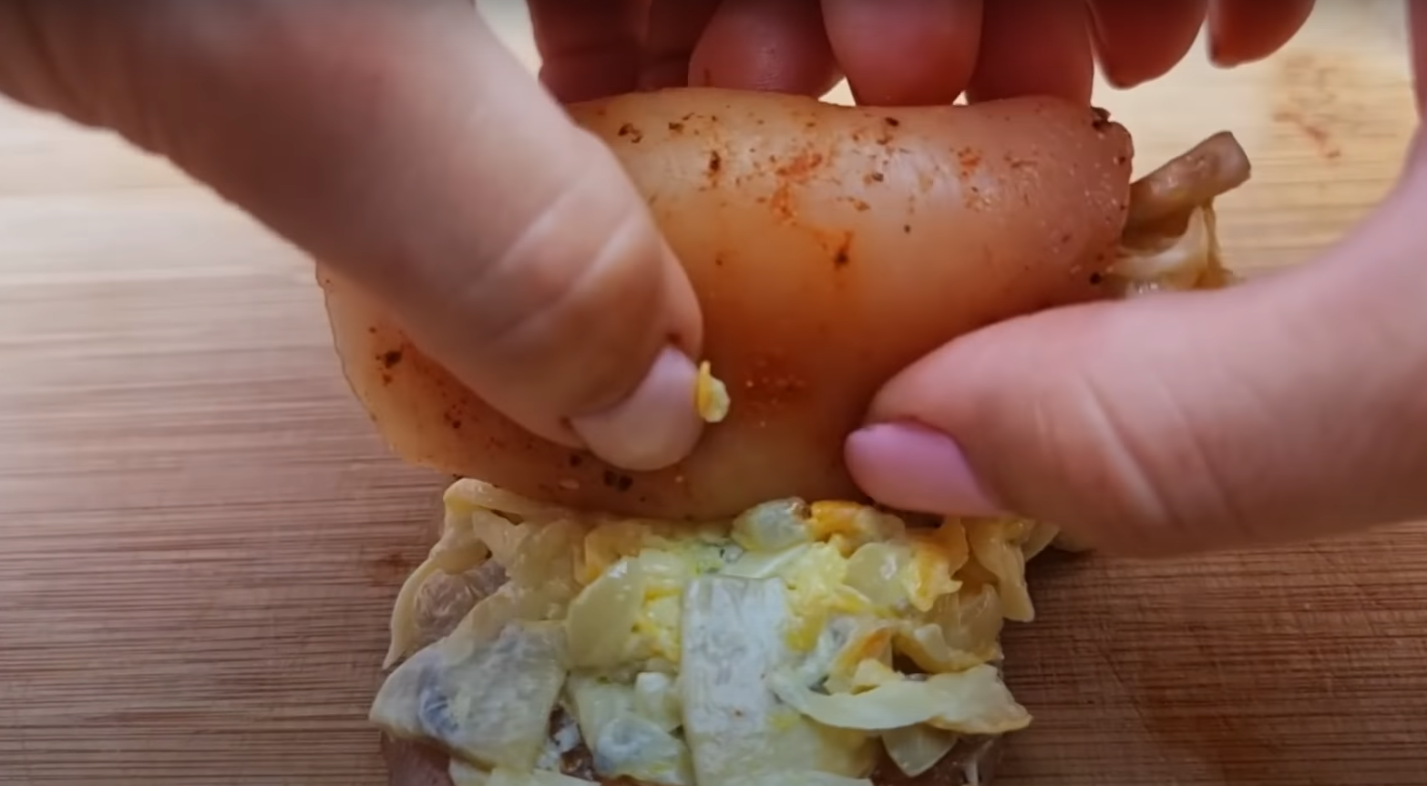 Połowę sera dodać do duszonych warzyw. Do duszonych warzyw dodać śmietanę. Doprawić szczyptą soli. Masę wyłożyć na kawałki kurczaka. Zawinąć roladki w masę.