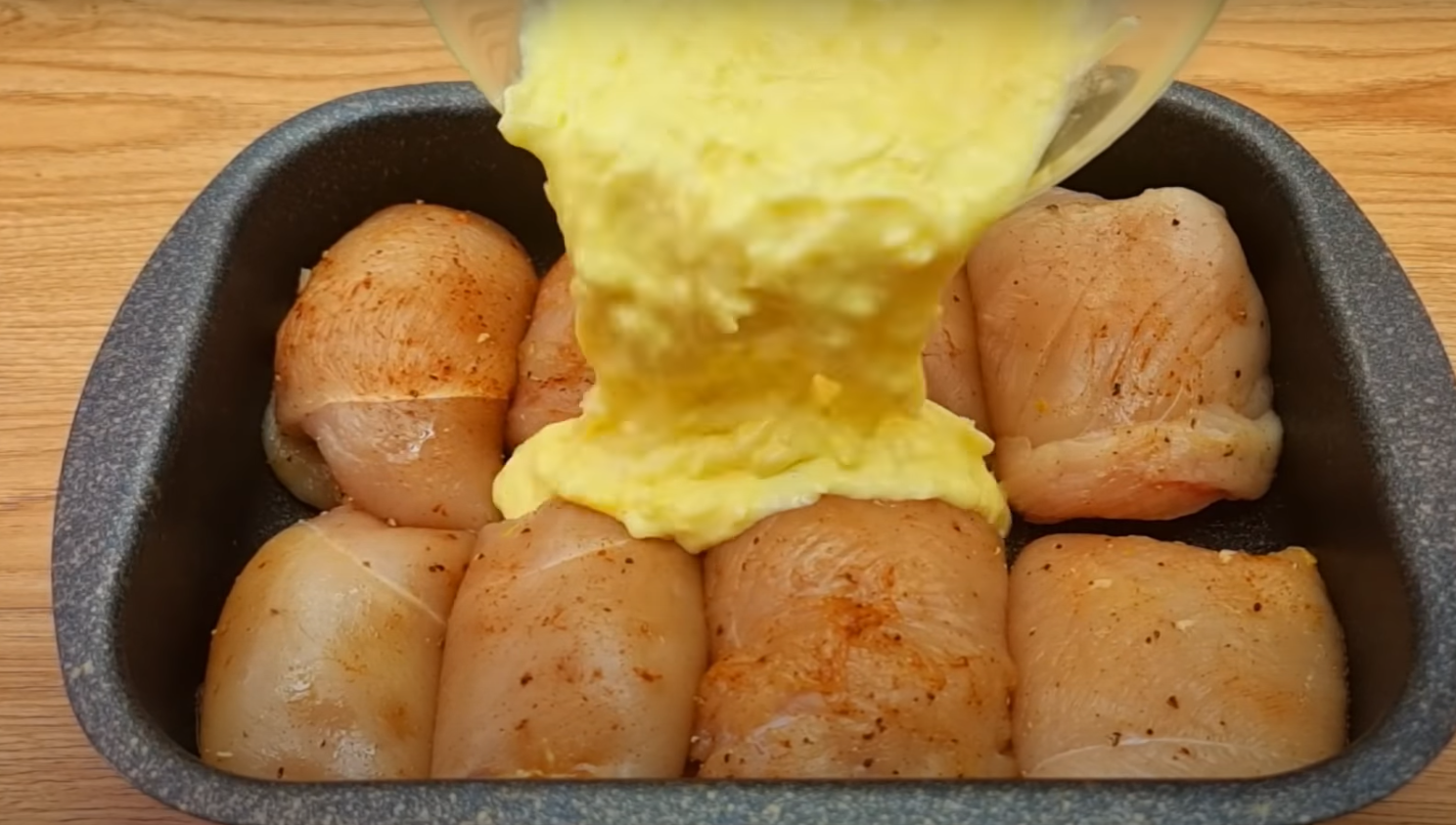 Ułożyć roladki na wysmarowanym tłuszczem naczyniu do pieczenia. W osobnej misce wymieszać jajko, jogurt i sól. Piec przez 30 minut w temperaturze 200°C.