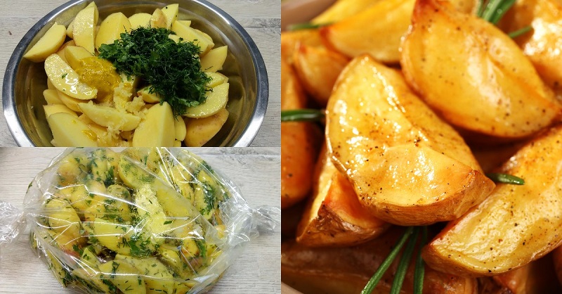 Najpierw należy umyć oraz obrać ziemniaki. Jeśli decydujemy się na młode ziemniaki, należy upiec je ze skórką. Następnie kroimy ziemniaki na ćwiartki i przebijamy je szpikulcem w kilku miejscach.