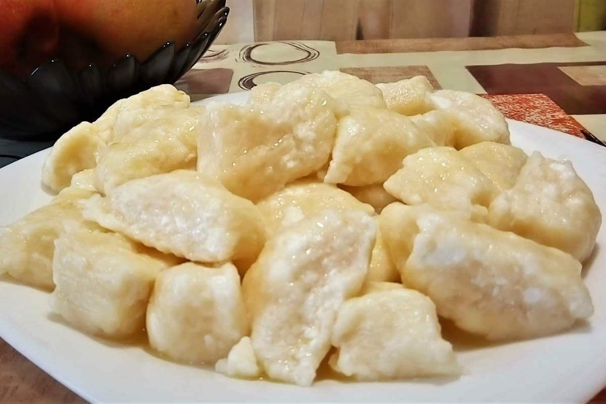 W garnku należy zagotować wodę, delikatnie ją soląc. Do wrzątku wrzucamy oddzielone łyżką kawałki ciasta i od chwili ponownego zagotowania wody pierogi gotujemy jeszcze przez lekko ponad minutę.