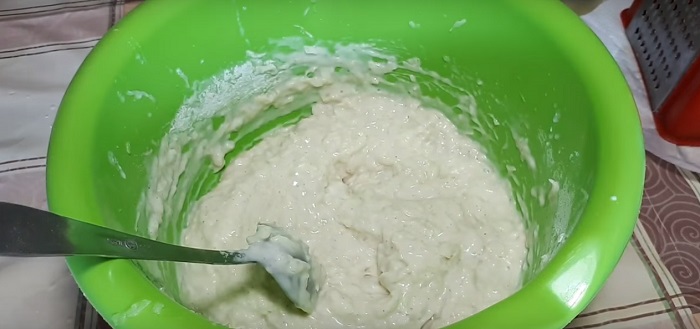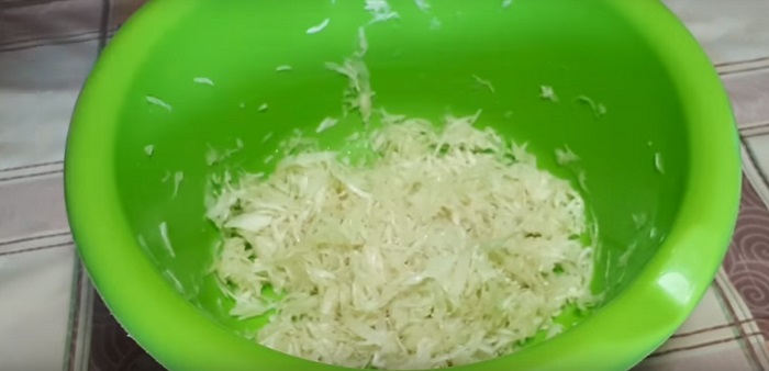 Na tarce o grubych oczkach zetrzyj cebulę i dodaj ją do kapusty, wszystko wymieszaj.Dodaj kefir, jajko, mąkę i proszek do pieczenia do tego samego pojemnika. I znowu mieszaj wszystko, aż uzyskasz masę o konsystencji gęstej śmietany.