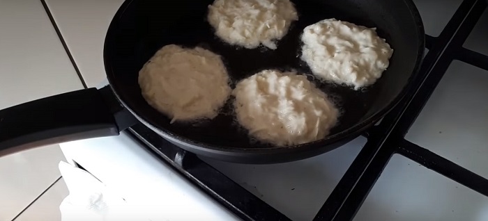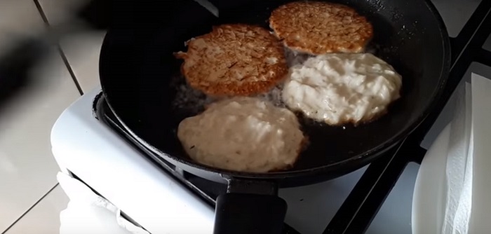 Rozgrzej patelnię z dodatkiem oleju. Gdy olej jest ciepły, użyj łyżki stołowej, aby rozłożyć porcjami placki,tak jak tradycyjne placki ziemniaczane.