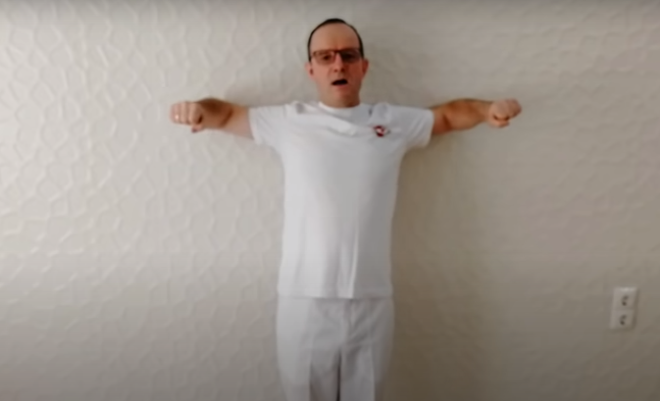 Aby wykonać ćwiczenie 1, stań plecami do ściany i zrób mały krok w jej kierunku. Następnie oprzyj barki i łopatki o ścianę. Ręce powinny być ustawione pod odpowiednim kątem. Rozluźnij barki i łokcie, dociskając je do ściany.