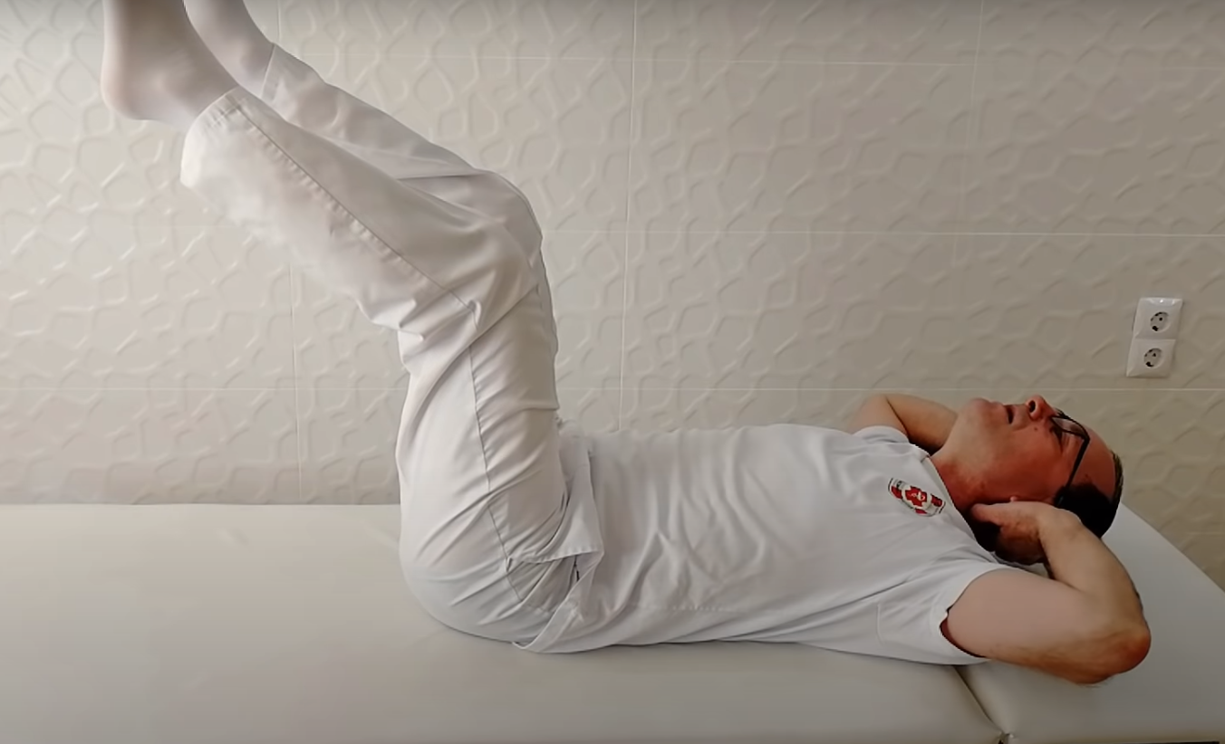 Jest to świetne ćwiczenie łagodzące ból w okolicy kości krzyżowej. Aby wykonać to ćwiczenie, połóż się na plecach na kanapie lub podłodze i unieś nogi do kolan. Jeśli jest to niemożliwe ze względu na silny ból, można podeprzeć głowę taboretem lub niskim stołkiem. Połóż ręce za głową i zrób wydech. Podnieś podbródek na wysokość 5-10 cm, nie poruszając szyją.